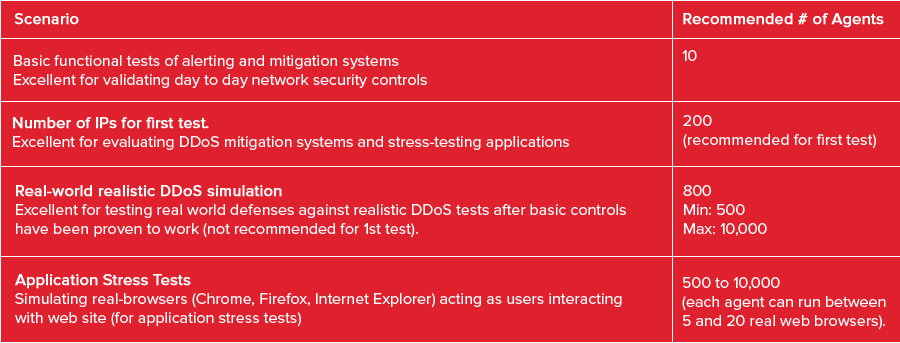 We recommend using 200 attackers and 4 monitors for an initial test. This is the number included in managed test bundles. Additional agents can be purchased if required. In subsequent tests, depending on how the first test went, the number of agents should be increased from between 500 to 1000. The more agents used the more realistic the DDoS attack.