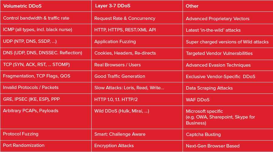 The list of DDoS tests is extensive (over 300) and include all layers 2 through 7, the latest in-the-wild attacks (e.g. Mirai), IPV4 and IPV6, and all popular protocols.
