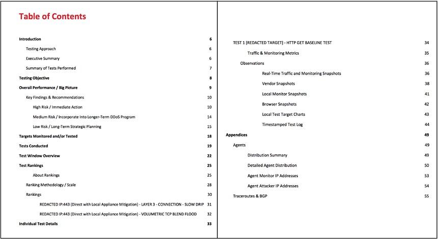 A redacted report / template is available once a mutual non-disclosure agreement has been executed (MNDA). Reports are typically around 100 pages long and include executive summaries, individual test rankings, and detail sections for every attack vector with charts/graphs/observations.