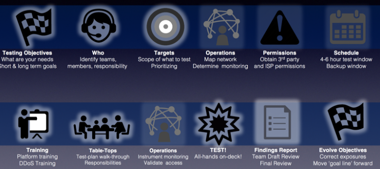 2. DESIGN:Targets (domain names, URL’s, IP addresses) will be analyzed from an ‘attacker’ perspective and a profile will be created for each target. Potentially, this will uncover new potential attack variations that can be considered. Following the profiling a test plan will be created to fit within the given test windows. Each ‘test’ will take approximately 20 minutes with a 5 minute cool-down. The first few tests will be longer and later tests will be shorter. Approximately 2 tests can be run per hour. Creating the initial test plan will require some back/forth via secure email with your teams. The test plan is distributed in an XLS template that contains all the information for every party joining the test.