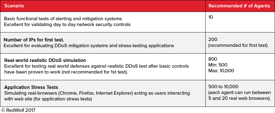 We recommend using 200 attackers and 4 monitors for an initial test. This is the number included in managed test bundles. Additional agents can be purchased if required. In subsequent tests, depending on how the first test went, the number of agents should be increased from between 500 to 1000. The more agents used the more realistic the DDoS attack.